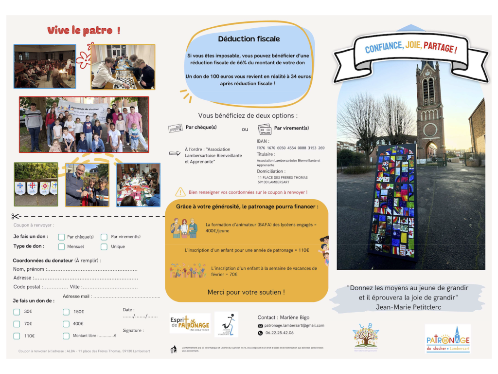Le patronage du clocher de Lambersart lance un appel aux dons pour financer le poste salarié, les frais de structure, le matériel pour les activités et les investissements à venir.